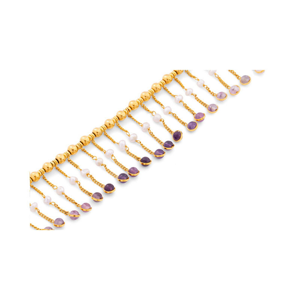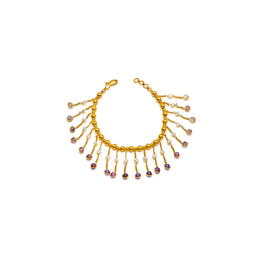 ذهب أصفر عيار 22 (13.903 جرام)، جمشت (1.575 جرام)، ولؤلؤ بحريني طبيعي (0.25 جرام) تقريبًا.