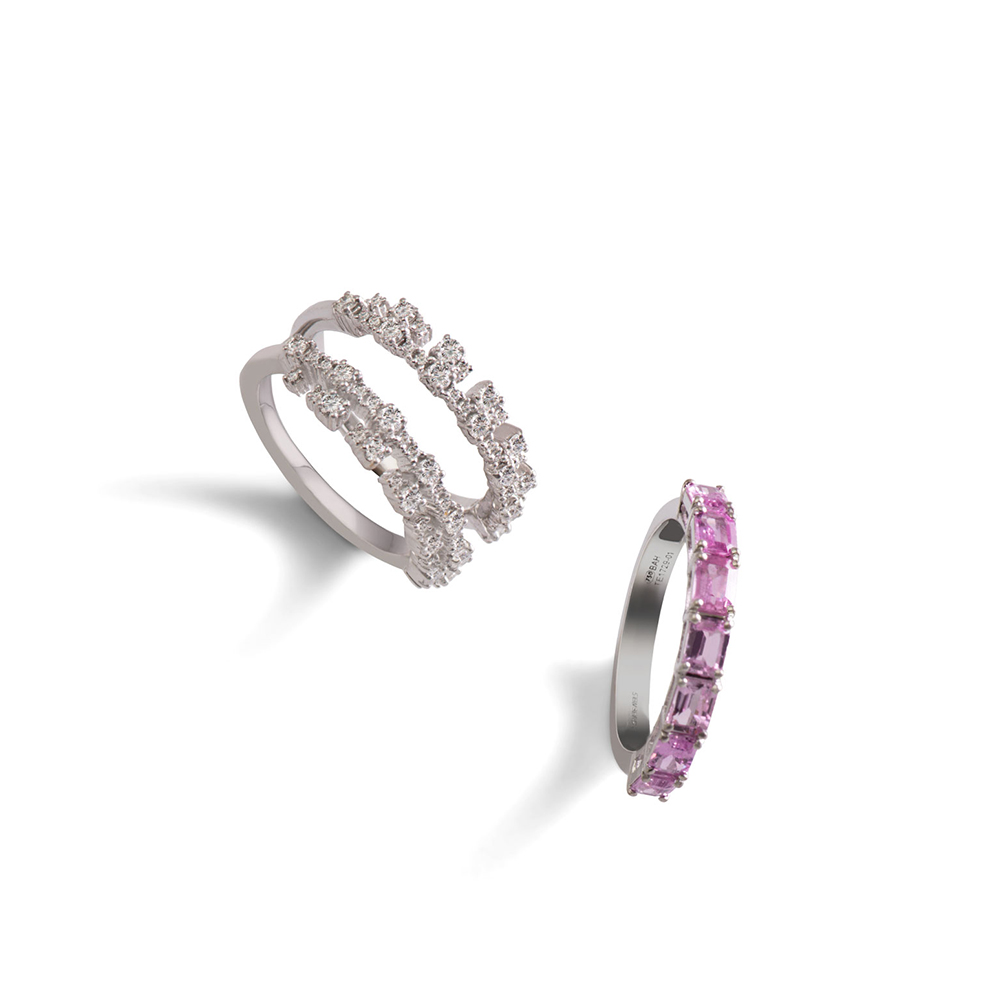 ذهب أبيض عيار 18 (10.434 جرام)، مرصع بالألماس درجة ڤي اس، اللون جي (1.715 قيراط)، وسفاير وردي (0.339 جرام) تقريبًا.