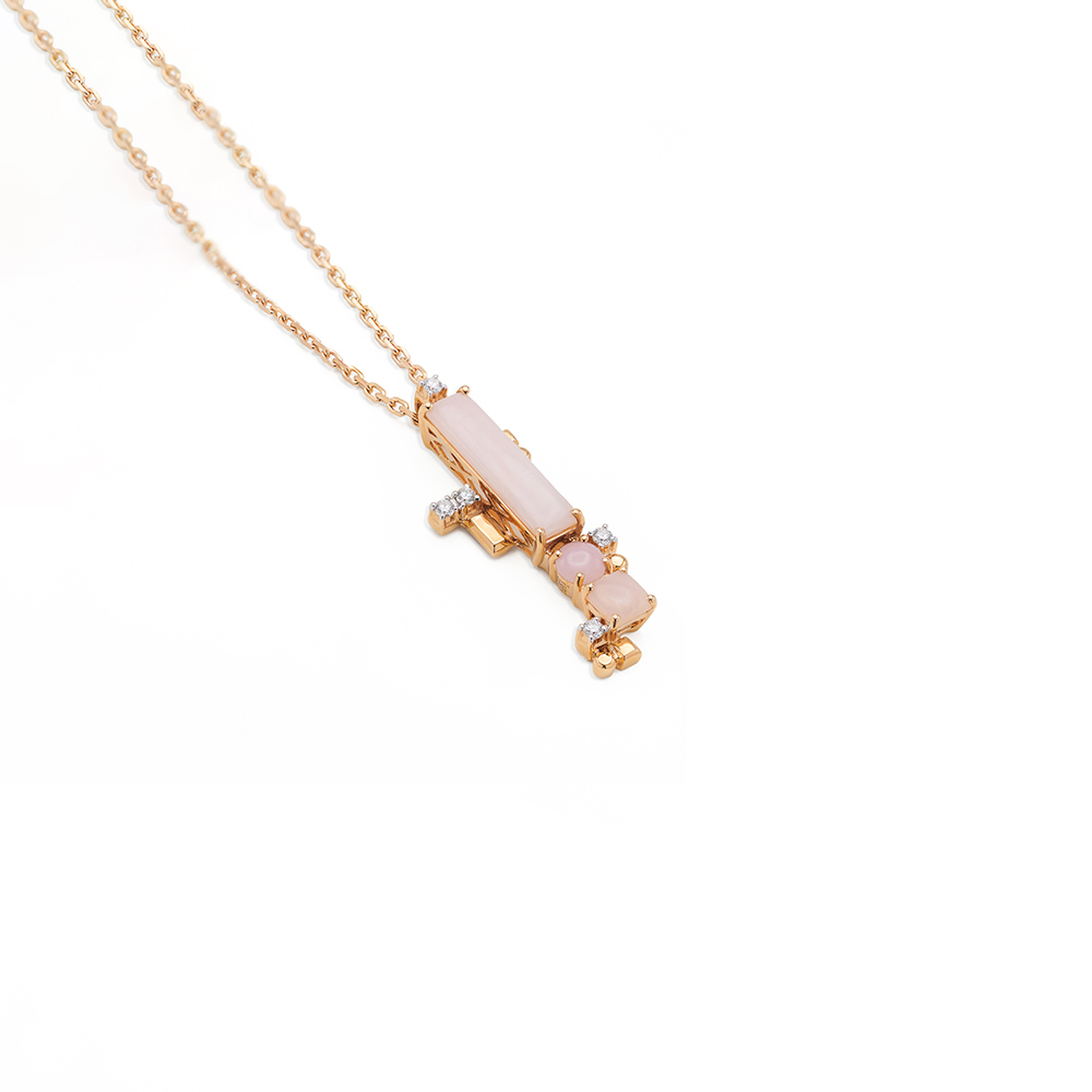 ذهب روز عيار 18 (9.605 جرام)، مرصع بالألماس درجة ڤي اس، اللون جي (0.15 قيراط)، وأوبال وردي (1.166 جرام) تقريبًا.