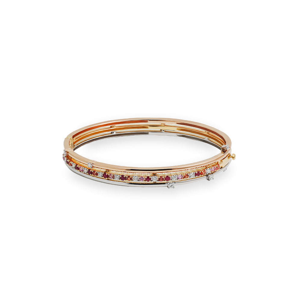 ذهب روز، ذهب ابيض، و ذهب اصفر عيار 18 (18 جرام)، مرصع بالالماس درجة ڤي اس، اللون جي (0.5 قيراط)، والاحجار الكريمة (0.18 جرام) تقريبًا.