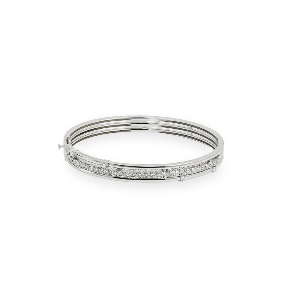 ذهب ابيض عيار 18 (18 جرام)، مرصع بالالماس درجة ڤي اس، اللون جي (1.06 قيراط) تقريبًا.