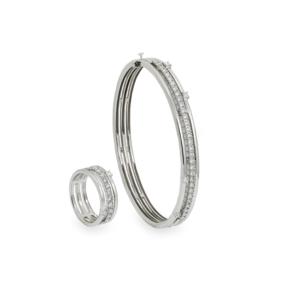ذهب ابيض عيار 18 (8.3 جرام)، مرصع بالالماس درجة ڤي اس، اللون جي (0.669 قيراط) تقريبًا.