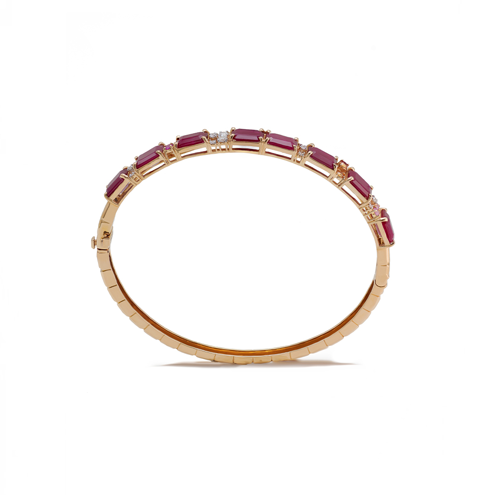 ذهب روز عيار 18 (12.31 جرام)، مرصع بالألماس درجة ڤي اس، اللون جي (0.42 قيراط)، وياقوت (1.272 جرام) تقريبًا.