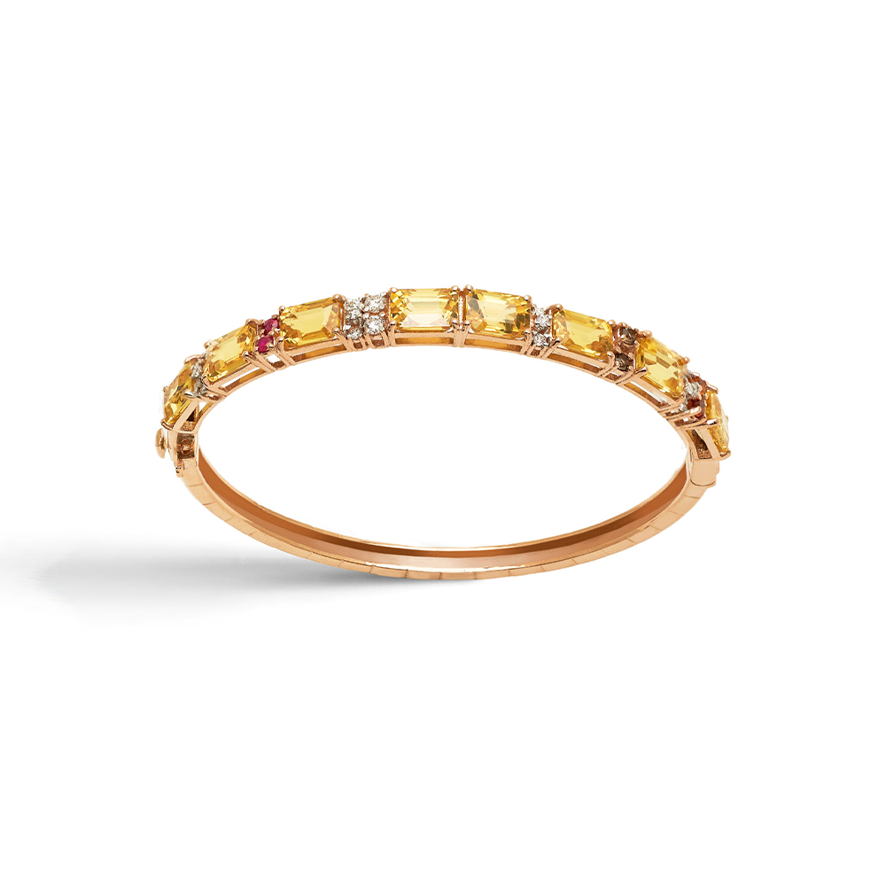 ذهب روز عيار 18 (12.31 جرام)، مرصع بالألماس درجة ڤي اس، اللون جي (0.42 قيراط)، وسفاير أصفر (1.272 جرام) تقريبًا.