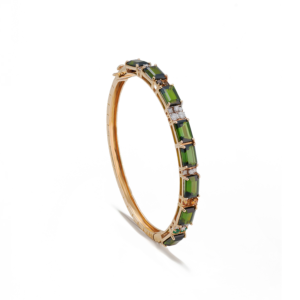 ذهب أصفر عيار 18 (12.31 جرام)، مرصع بالألماس درجة ڤي اس، اللون جي (0.42 قيراط)، وتورمالين أخضر (1.272 جرام) تقريبًا.