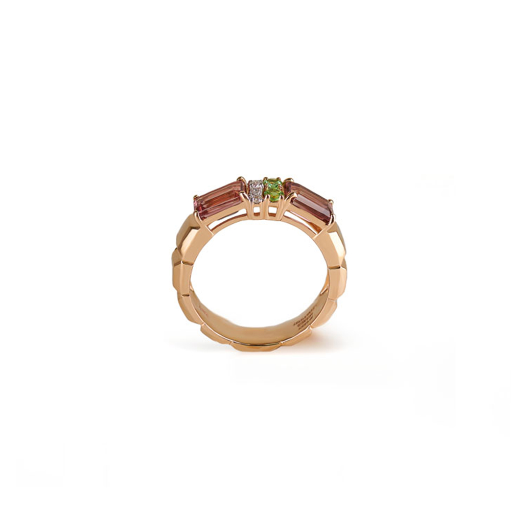 ذهب روز عيار 18 (5.515 جرام)، مرصع بالألماس درجة ڤي اس، اللون جي (0.09 قيراط)، وسفاير وردي (0.379 جرام) تقريبًا.